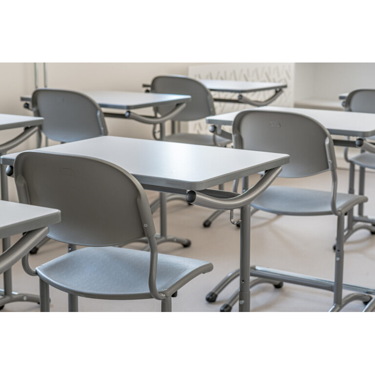 1130 Prima skolēnu galdiem ir regulējams augstums trīs līmeņos un rūpīgi izplānotas detaļas, piemēram, triecienizturīga maliņa, āķis somai, krēslu stiprinājums