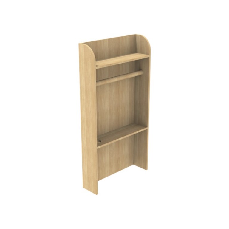 Pie sienas stiprināms plaukts ar sešiem nodalījumiem. Ārējais rāmis baltā vai dižskābarža krāsā. Iekšējie plaukti pieejami dažādās lamināta toņa apdarēs