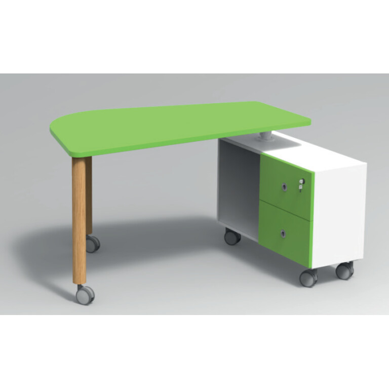 Galds skolotājiem ar kustīgu atvilktņu bloku un nestandarta formas virsmu. Atvilktnes slēdzamas. Kājas aprīkotas ar bloķējamiem ritenīšiem. Pieejamie virsmu toņi: