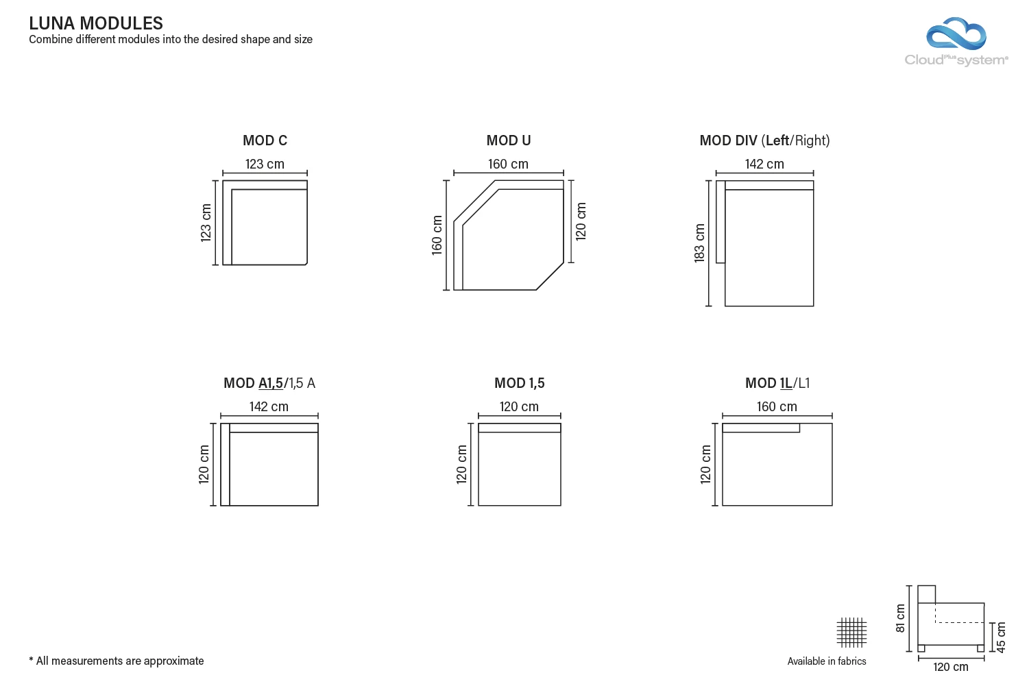 Luna dīvāns ir pieejams dažādos izmēros un audumos. Ar moduļu palīdzību izveidojiet dīvānu, kas lieliski piemērots jūsu mājām! Izvēlē ir arī īpaši ietilpīgs lielāks stūra dīvāns Luna.