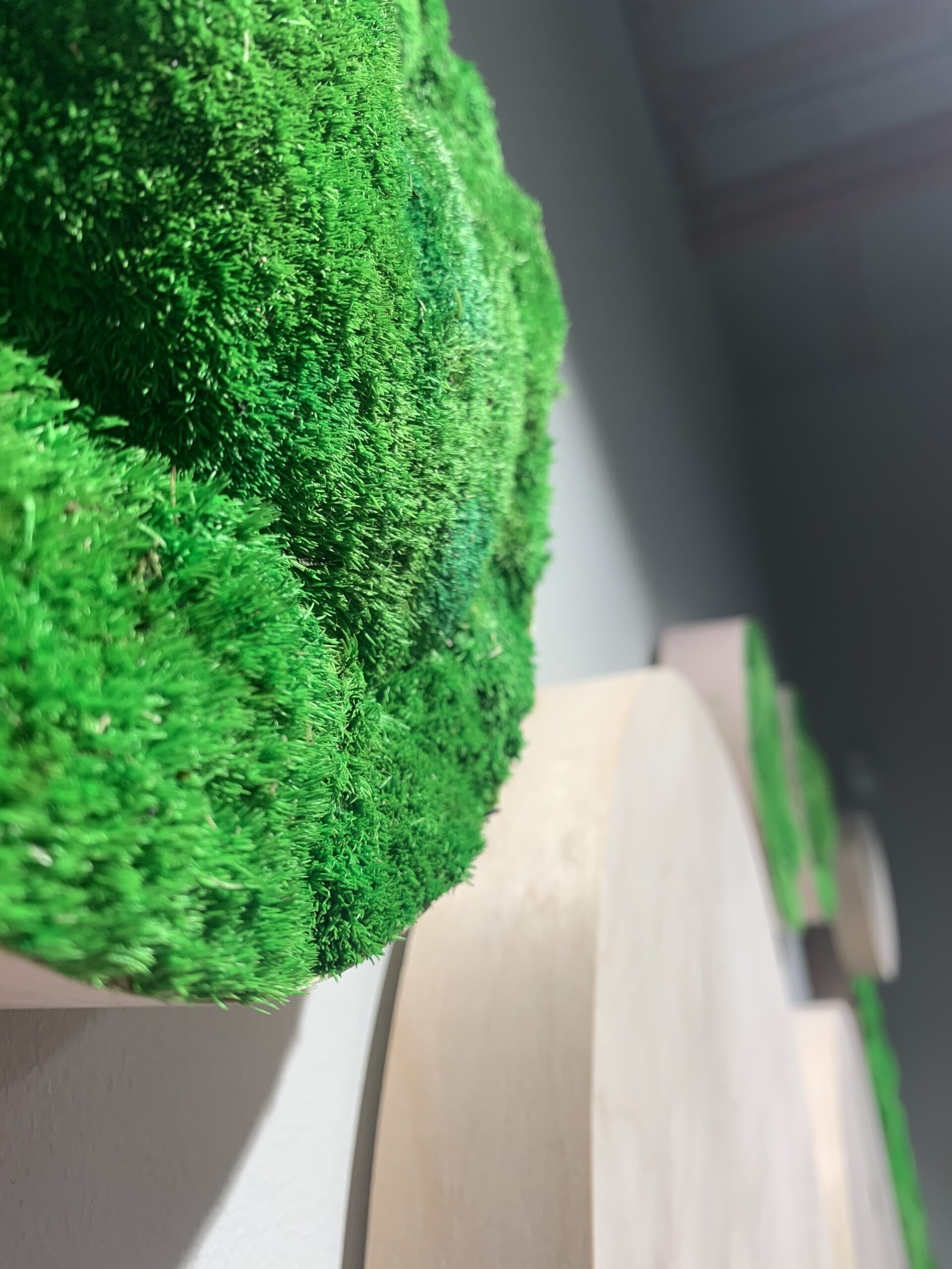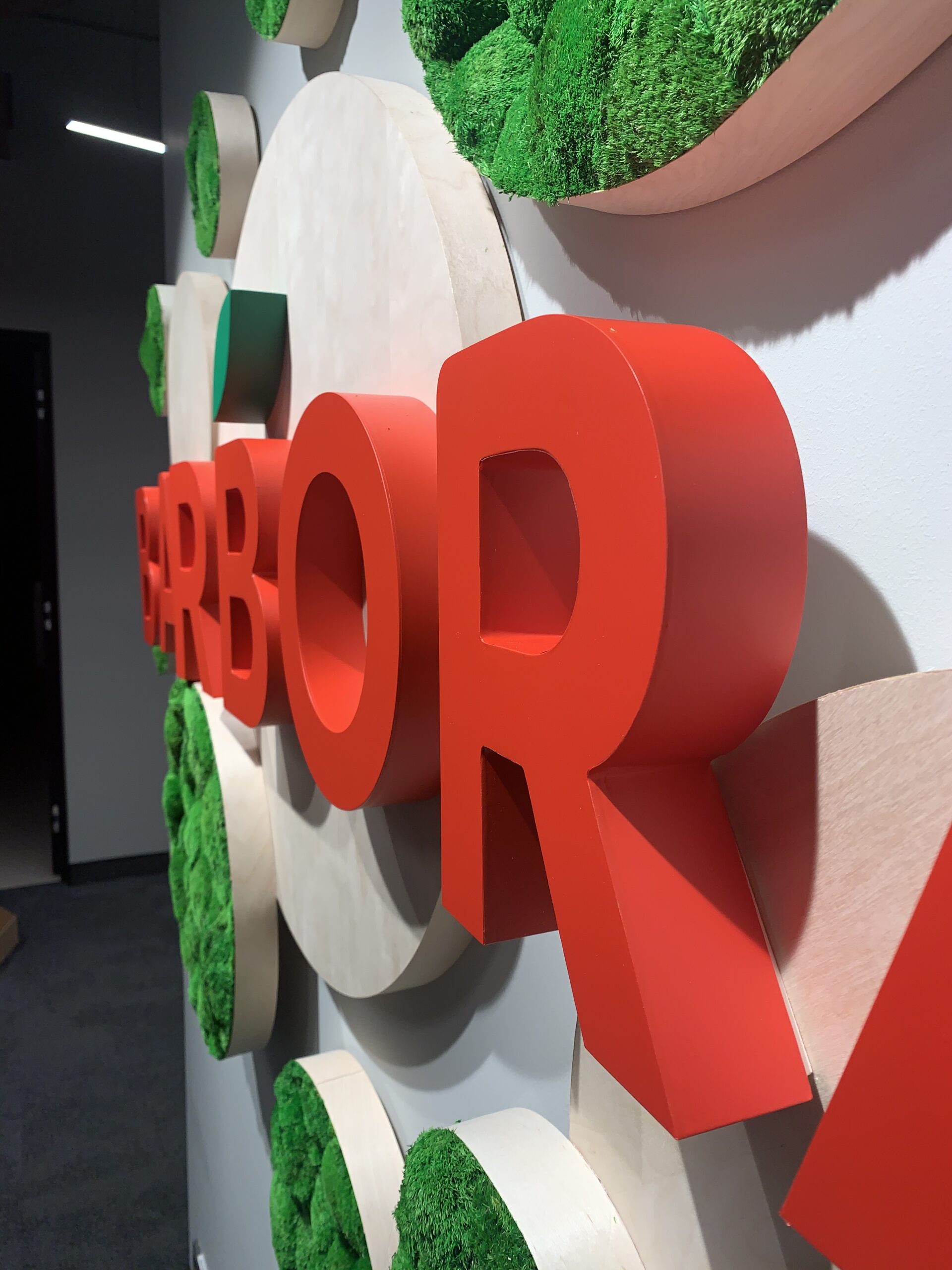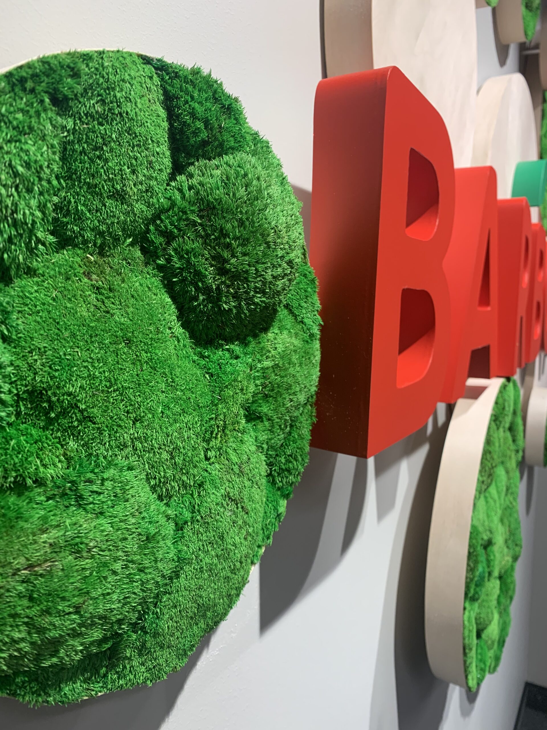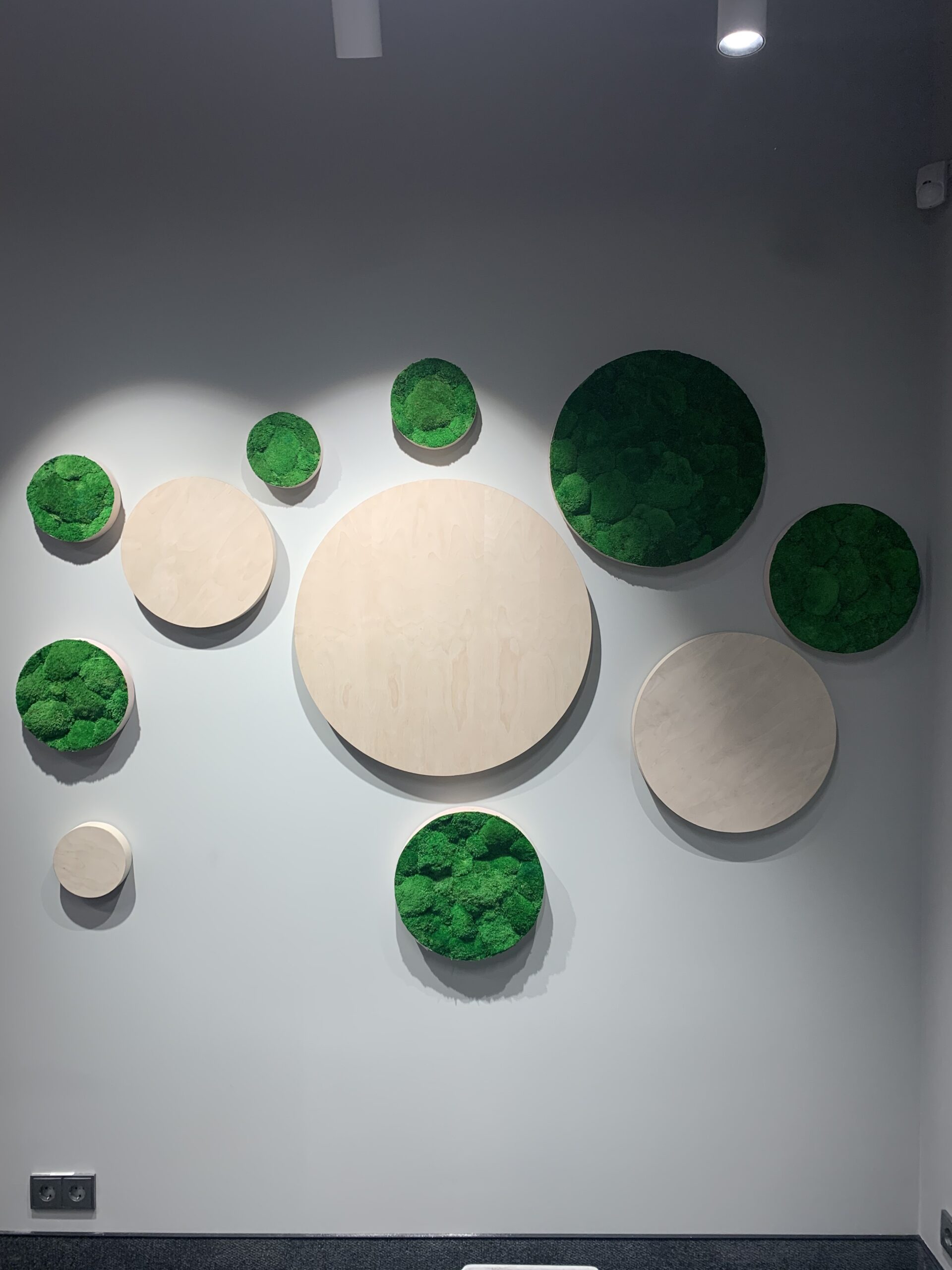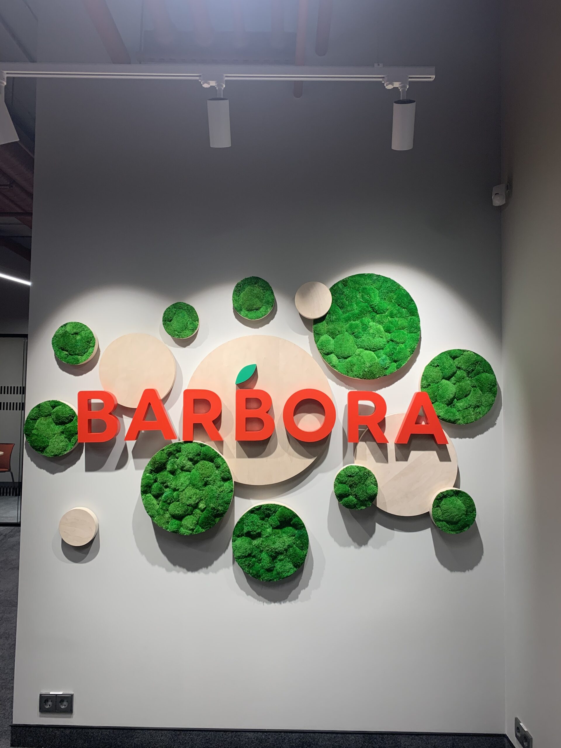 Barbora Rīgas birojā tika dekorēta siena ar zaļajiem sūnu dekoriem. Kombinējot klienta sagādātos logo burtus ar sūnu apļiem un koka diskiem, tiek panākts telpisks efekts.