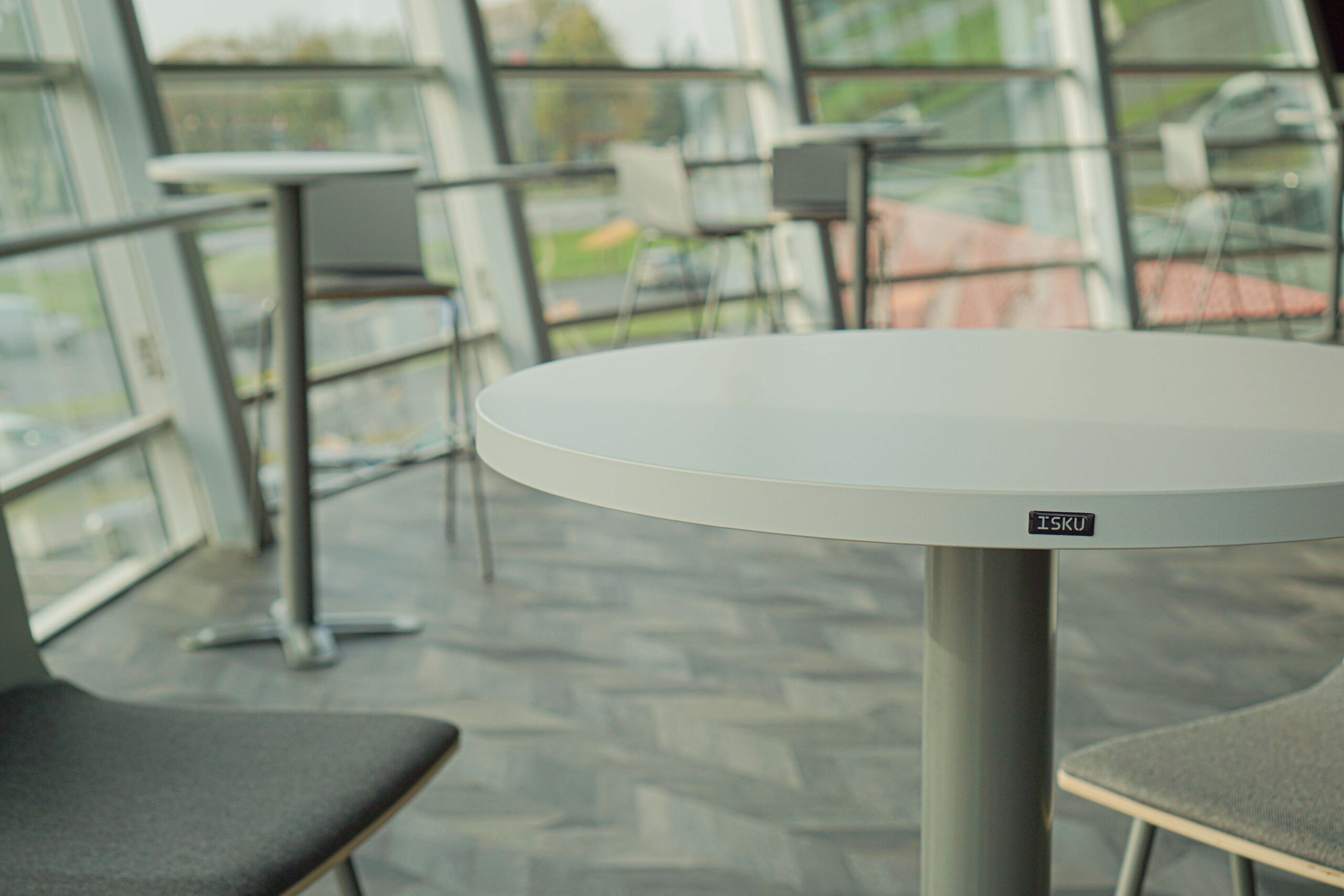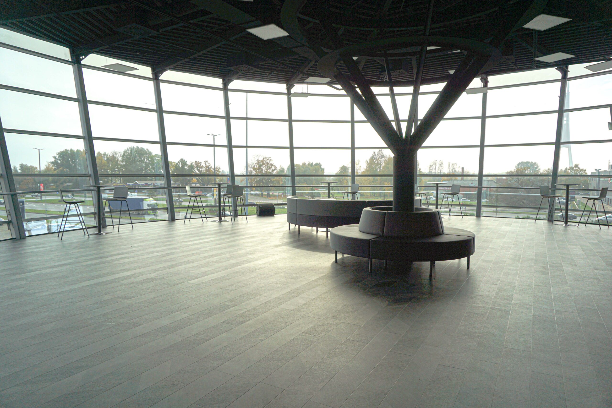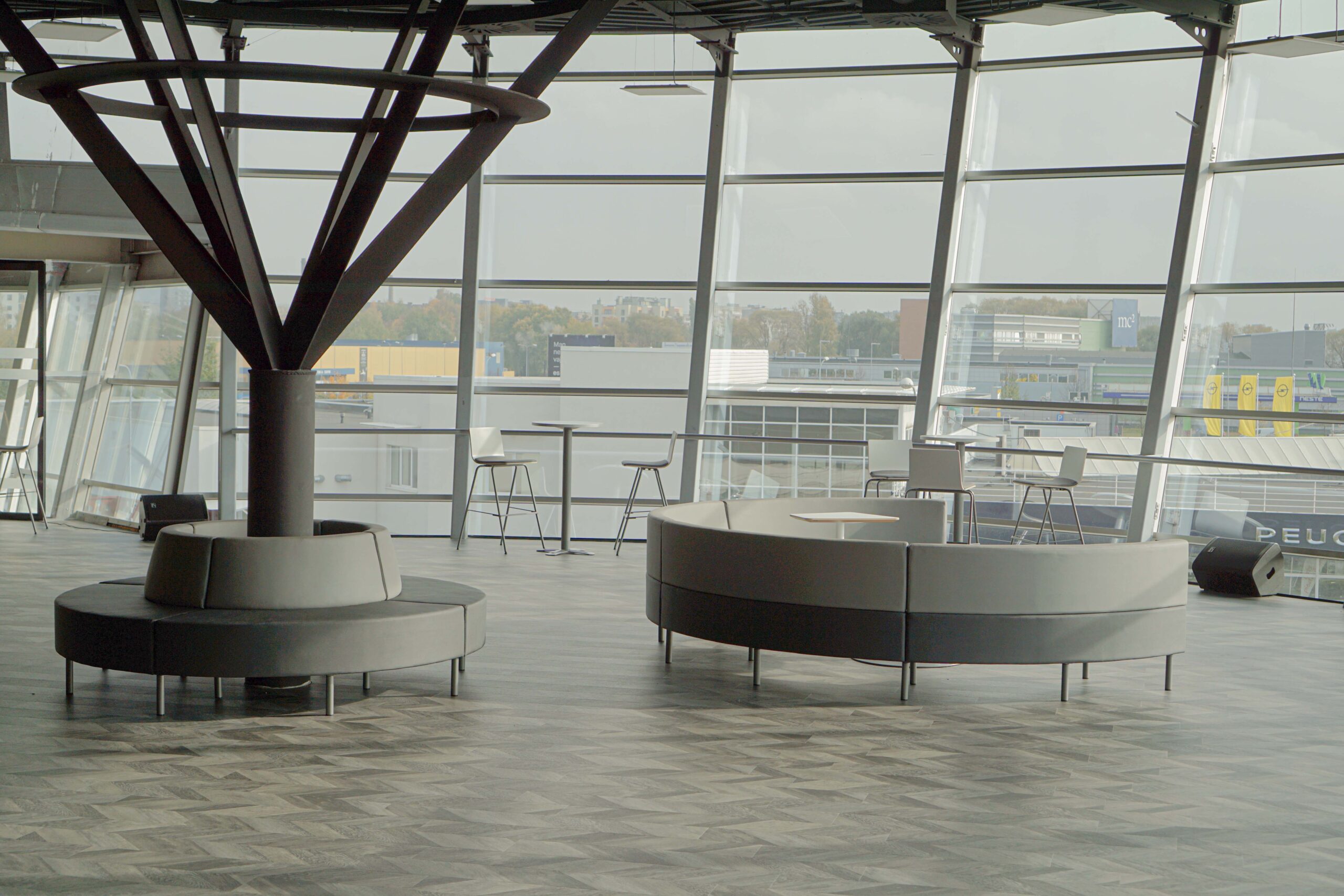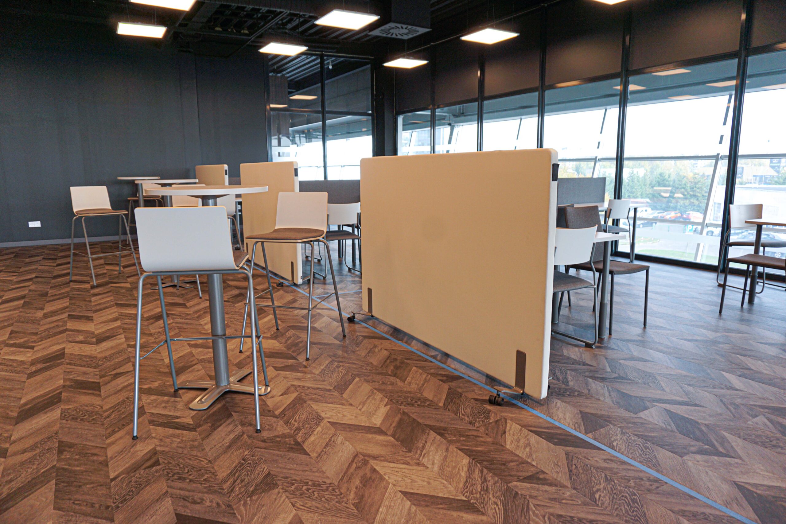 Ātrām sapulcēm vai kafijas pauzēm, plānojumā iekļauti augstie galdi ar bāra krēsliem. Funkcionāls ir šo mēbeļu grupu novietojums pie loga, jo tas ļauj baudīt skatu uz Rīgu un, nepieciešamības gadījumā, galdus var pārvietot.
