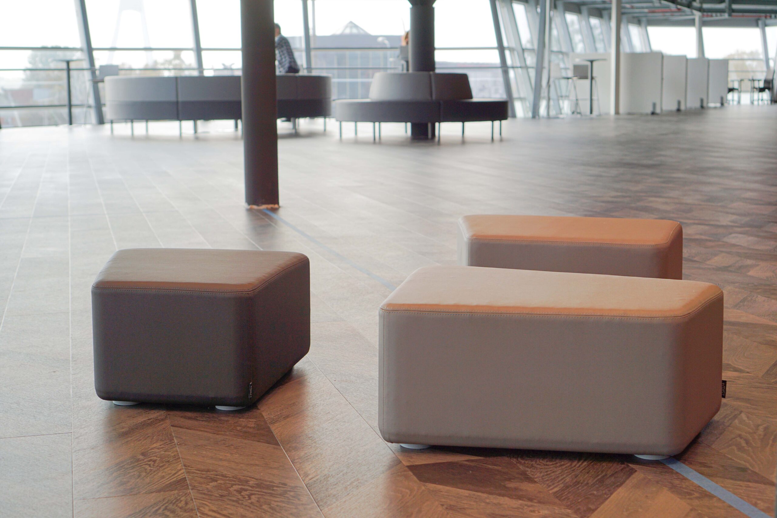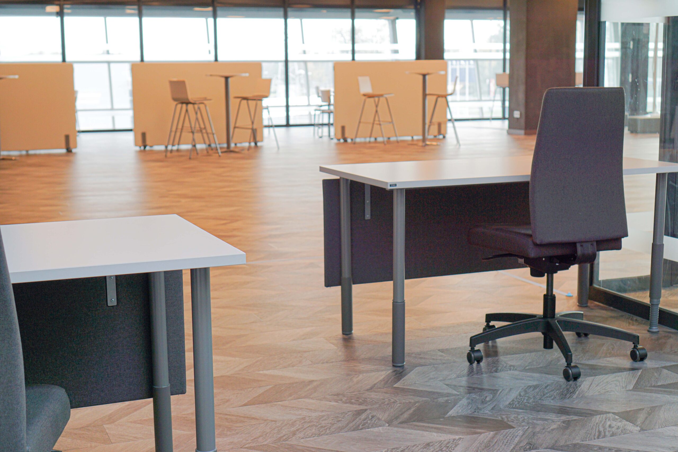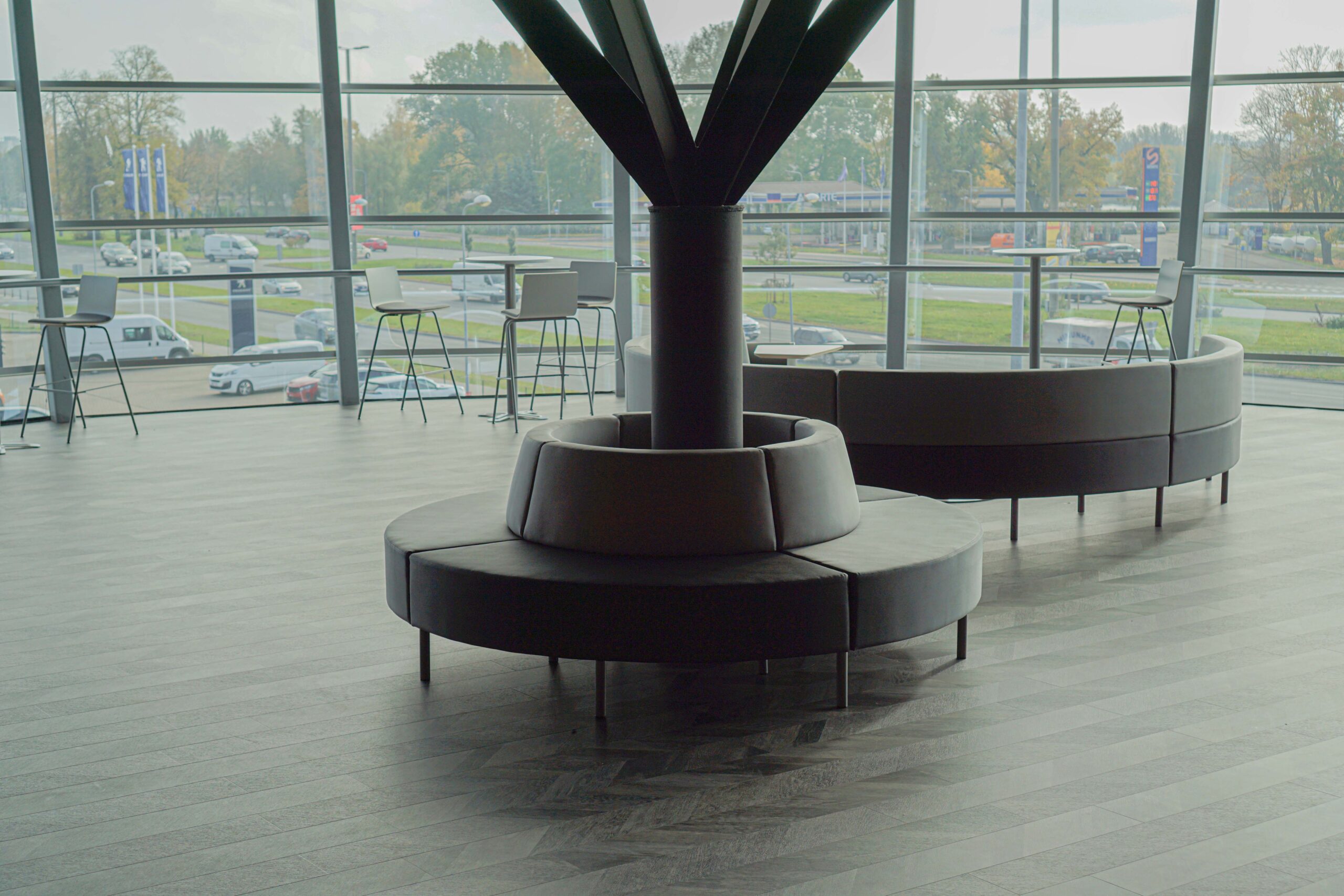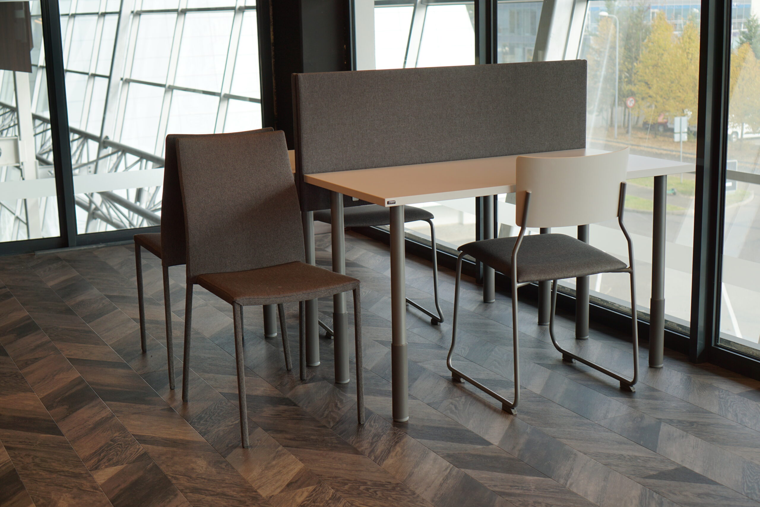 Ātrām sapulcēm vai kafijas pauzēm, plānojumā iekļauti augstie galdi ar bāra krēsliem. Funkcionāls ir šo mēbeļu grupu novietojums pie loga, jo tas ļauj baudīt skatu uz Rīgu un, nepieciešamības gadījumā, galdus var pārvietot.