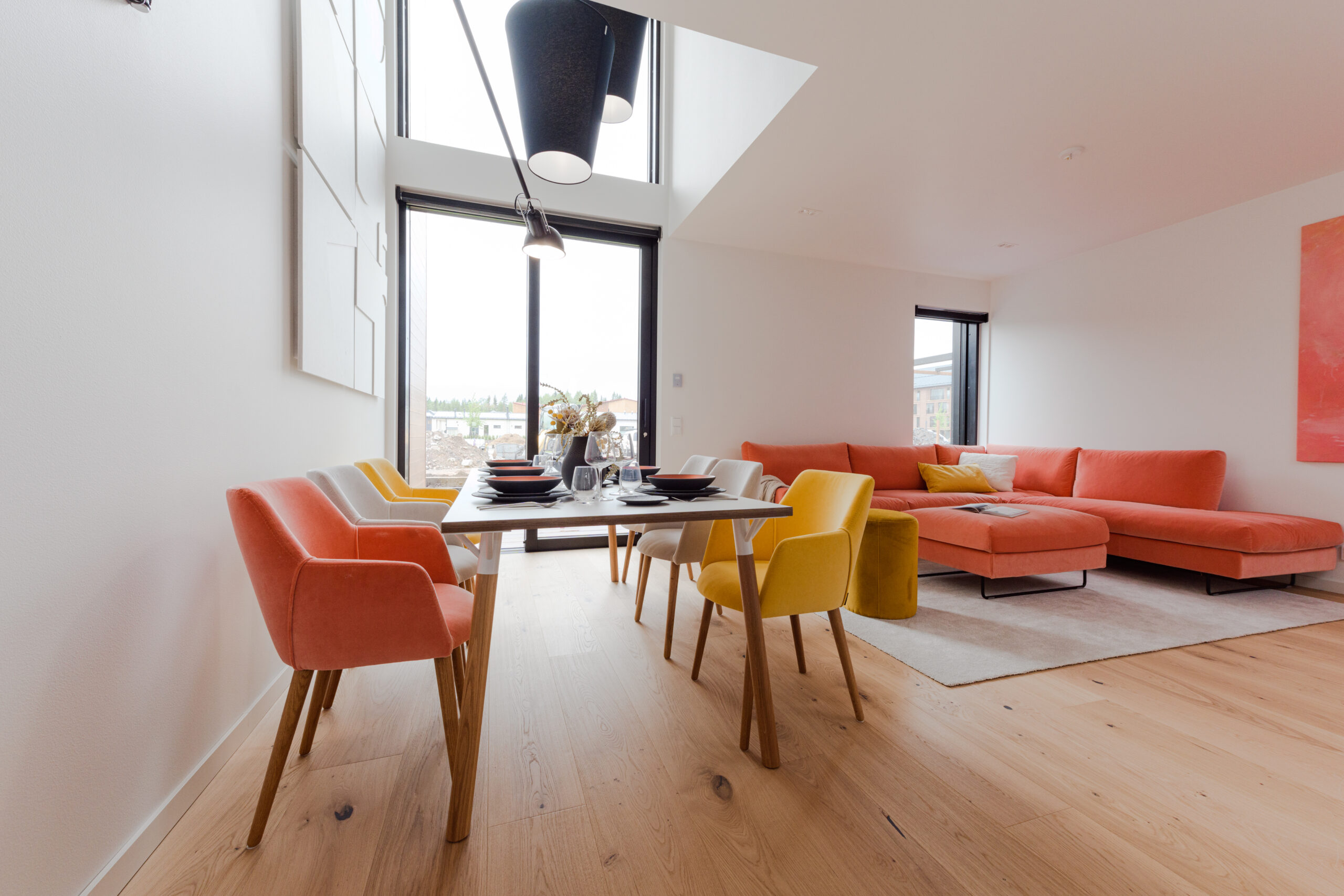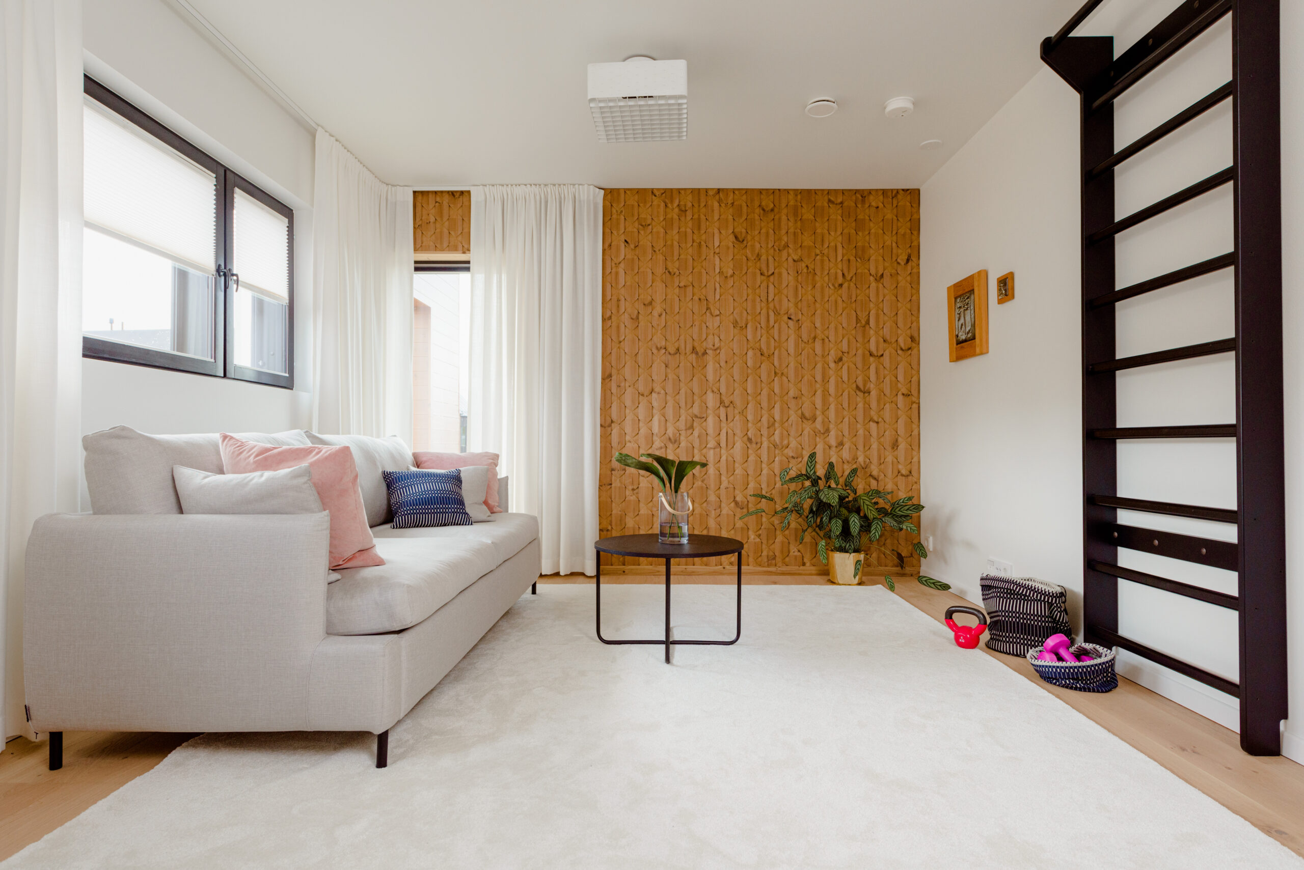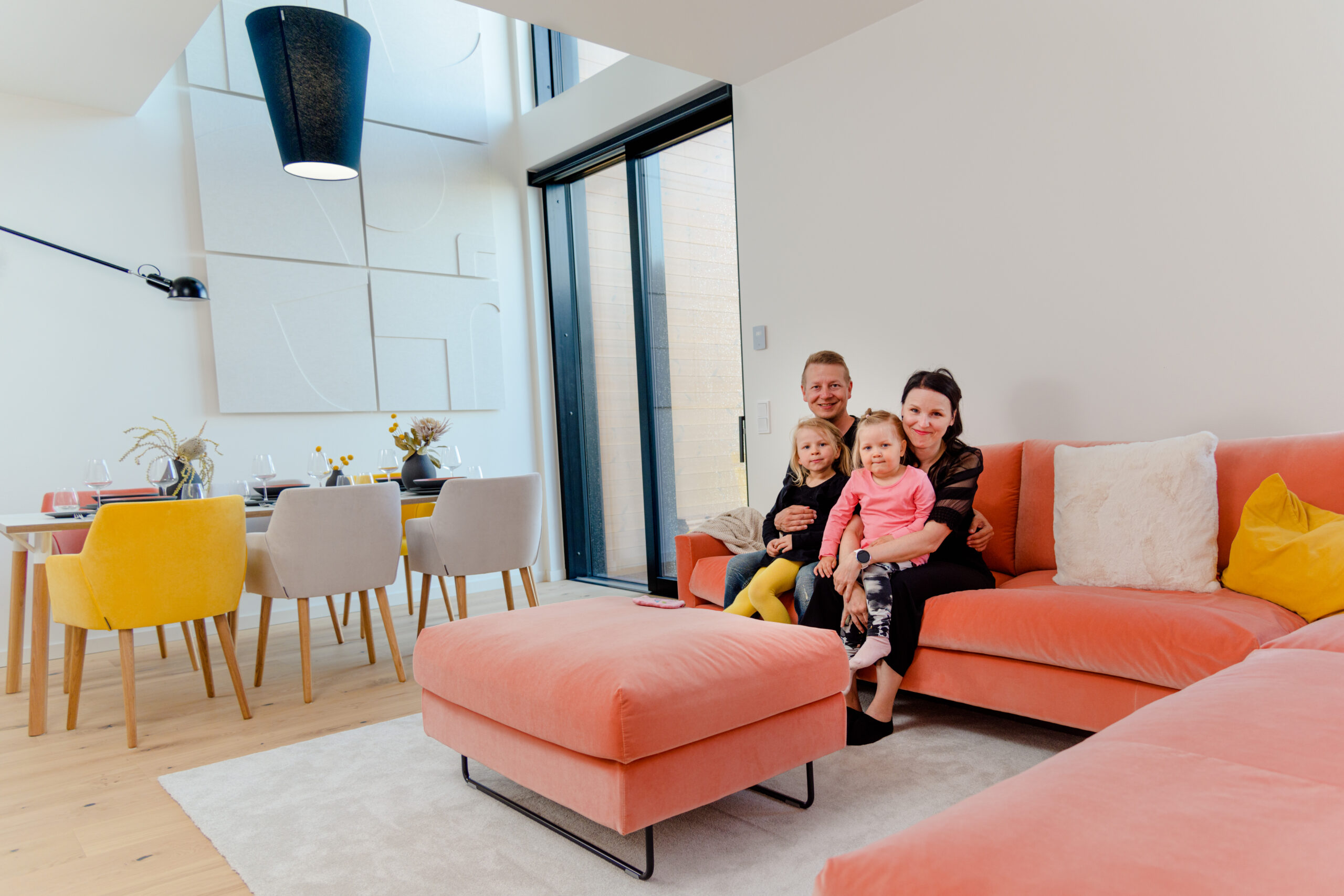 Viens no interjeriem tika veidots ģimenei ar diviem bērniem. Tajā iekļautas spilgtas un svaigas krāsas, kas kombinētas ar dabīgā koka elementiem.